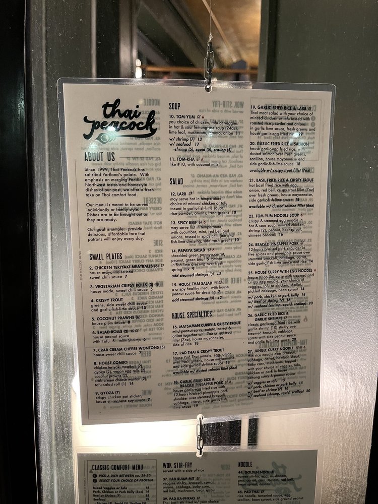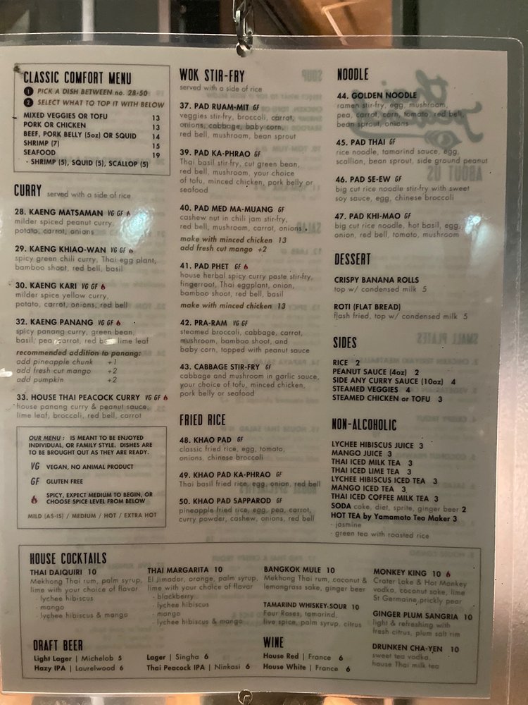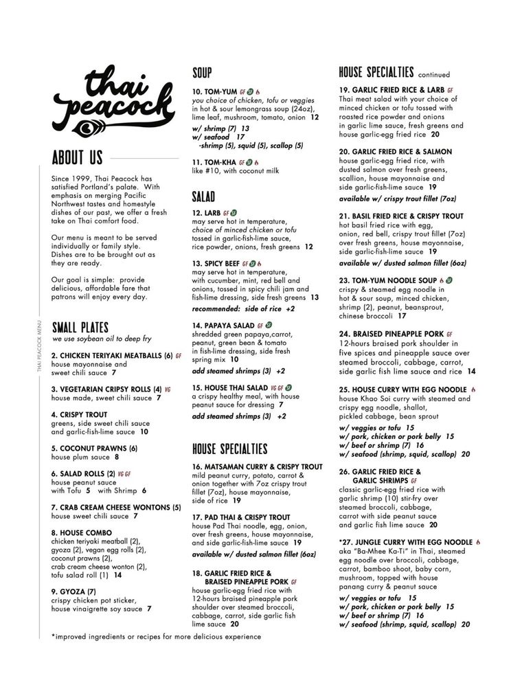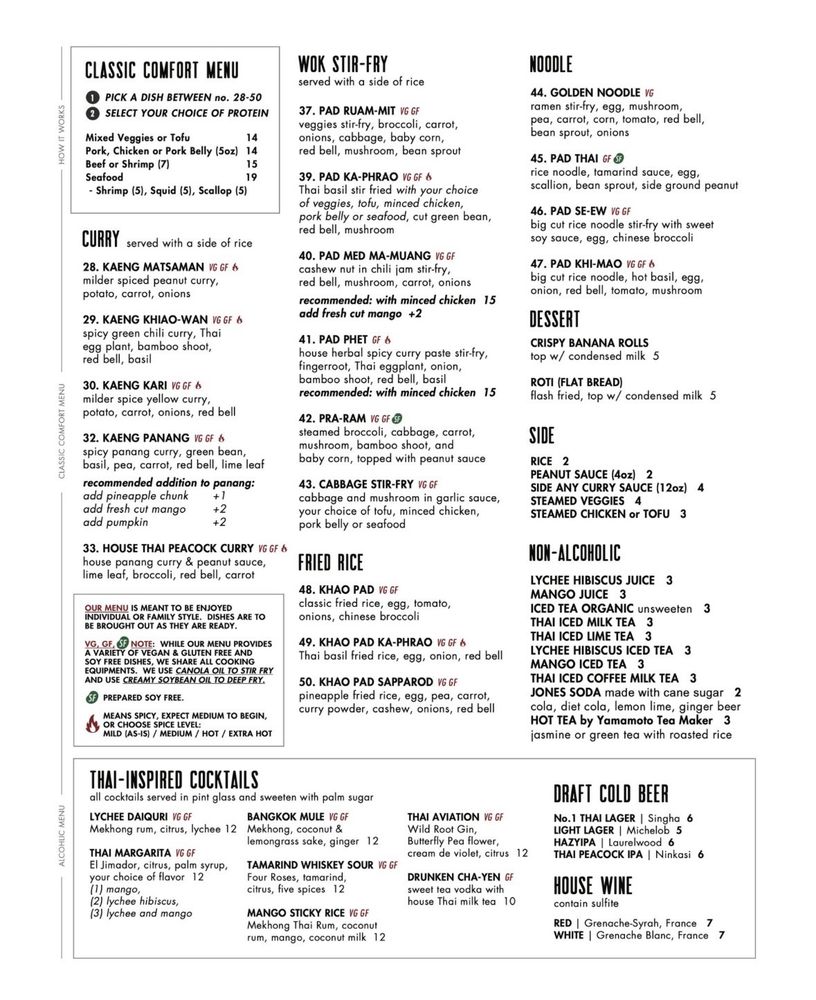 Introducing the menu at Thai Peacock, a comfort food Thai restaurant located in Portland, Oregon. Known for its delicious offerings, Thai Peacock provides a range of options including Pad Med Ma-Muang, Pad Khi-Mao, and Crab Cream Cheese Wontons. Customers rave about the flavorful dishes, from the larb with a spicy kick to the perfectly sweet and savory Pad Thai. The restaurant offers a diverse menu with options for vegans and vegetarians, along with happy hour specials and a full bar. The cozy ambiance and excellent service make it a go-to spot for authentic and flavorful Thai cuisine. Experience the vibrant flavors and generous portions at Thai Peacock, where every bite is a delight.