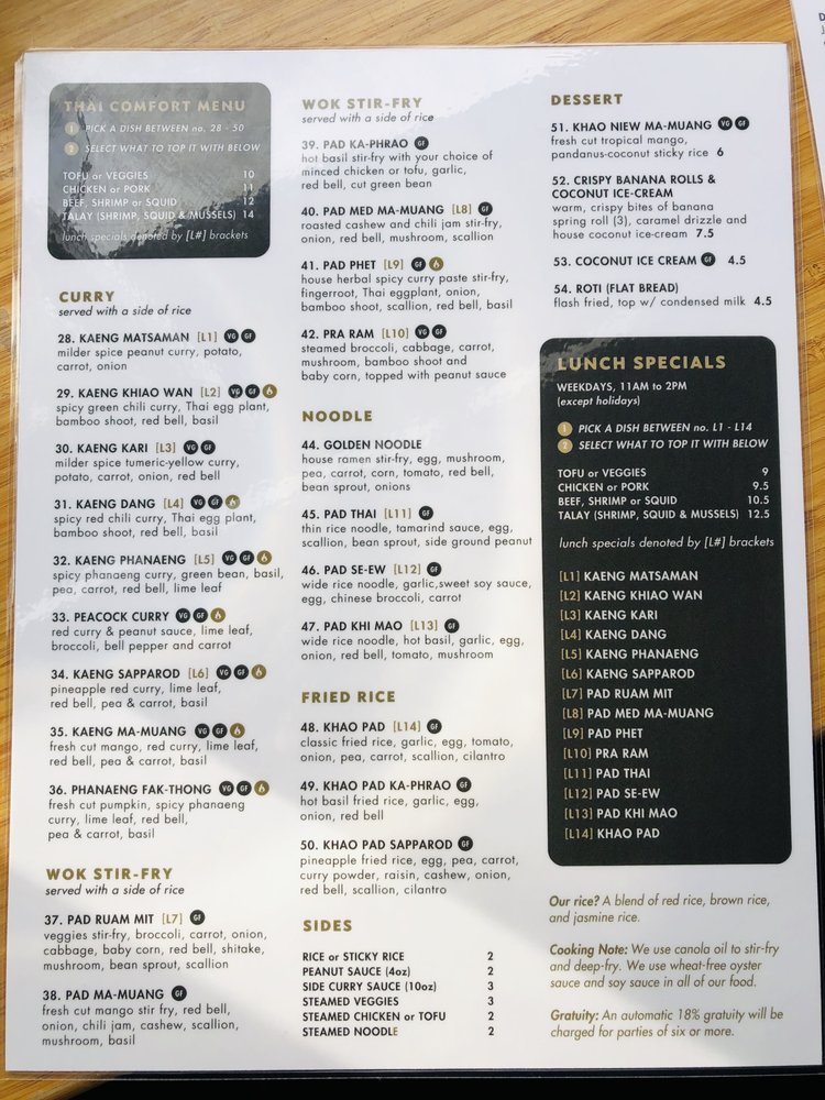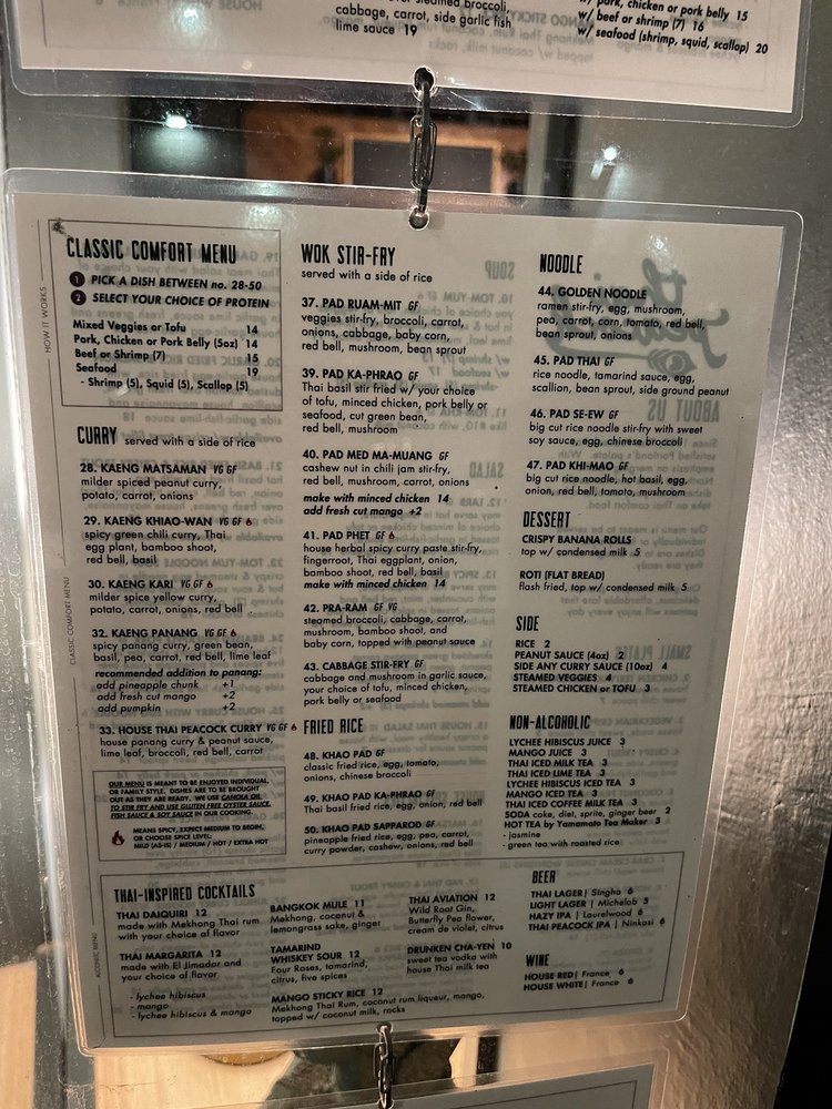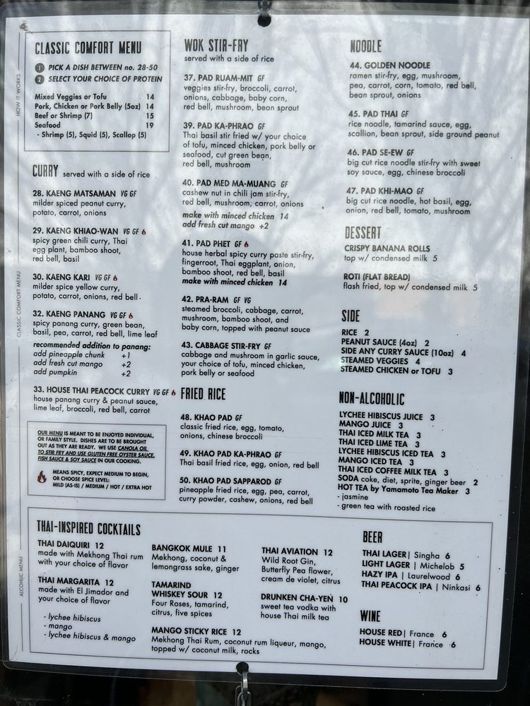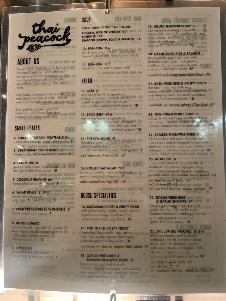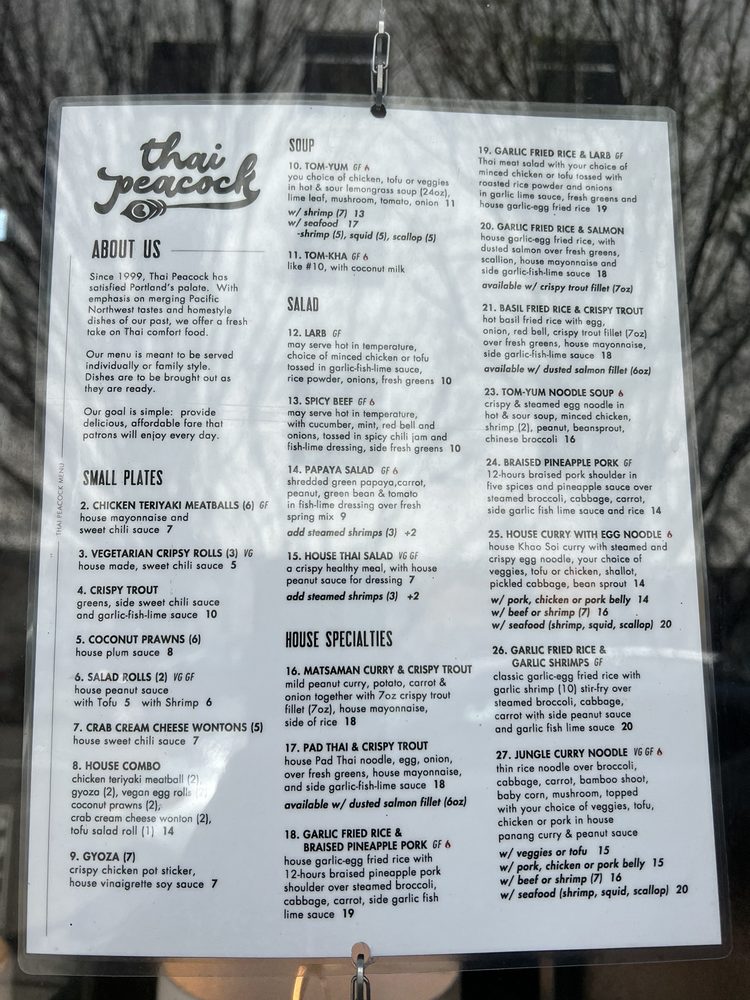 Introducing the menu at Thai Peacock, a comfort food Thai restaurant located in Portland, Oregon. Known for its delicious offerings, Thai Peacock provides a range of options including Pad Med Ma-Muang, Pad Khi-Mao, and Crab Cream Cheese Wontons. Customers rave about the flavorful dishes, from the larb with a spicy kick to the perfectly sweet and savory Pad Thai. The restaurant offers a diverse menu with options for vegans and vegetarians, along with happy hour specials and a full bar. The cozy ambiance and excellent service make it a go-to spot for authentic and flavorful Thai cuisine. Experience the vibrant flavors and generous portions at Thai Peacock, where every bite is a delight.